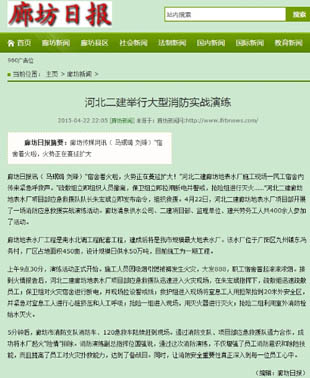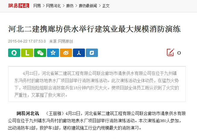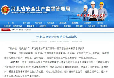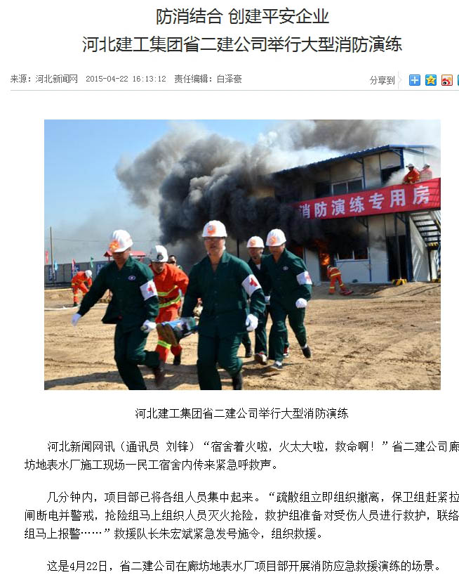 河北新聞網(wǎng)等多家媒體報道我消防實(shí)戰演練 來(lái)源: 修改時(shí)間:2015.04.23 瀏覽:7145 河北新聞網(wǎng)等多家媒體報道我消防實(shí)戰演練 2015年4月22日,公司在廊坊地表水廠(chǎng)組織了一次施工現場(chǎng)消防應急救援實(shí)戰演練。來(lái)自業(yè)主、監理和勞務(wù)隊的400多人參加了此次活動(dòng)。 當日,河北新聞網(wǎng)、河北安全生產(chǎn)雜志、網(wǎng)易河北、廊坊電視臺、廊坊日報等多家新聞媒體對此進(jìn)行了報道。(閆子明) 上一條 返回列表 下一條