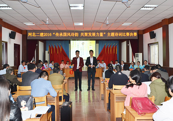 “曲終人散空愁暮,招屈亭前水東注?!?月26日上午,由公司黨委、工會(huì )、團委聯(lián)合舉辦的河北二建“傳承國風(fēng)詩(shī)韻·共聚發(fā)展力量”主題詩(shī)詞比賽決賽在公司培訓中心畫(huà)上了圓滿(mǎn)的句號。公司黨委書(shū)記、董事長(cháng)鄭青昌,黨委副書(shū)記、紀委書(shū)記、工會(huì )主席孫建格等領(lǐng)導全程觀(guān)看了這一場(chǎng)激動(dòng)人心、充滿(mǎn)古風(fēng)詩(shī)韻的比賽。9名特邀評委和60余名觀(guān)眾隊伍將氣氛烘托的好不熱鬧。