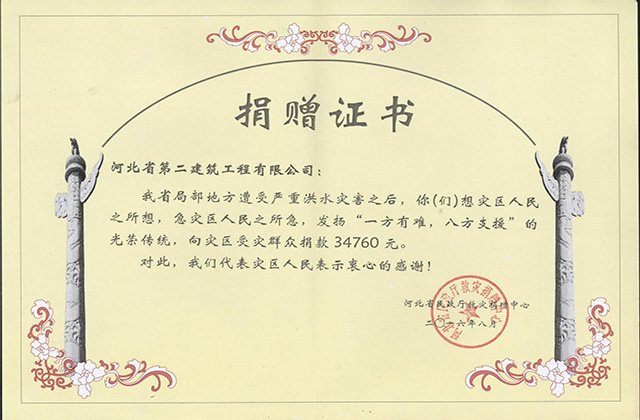 風(fēng)雨同舟、共度難關(guān),8月10日下午,公司政治工作部人員將34760元善款全部轉交至河北省民政廳救災捐贈中心工作人員的手中。省救災中心領(lǐng)導向公司頒發(fā)了《捐贈證書(shū)》,并對河北二建公司弘揚“一方有難,八方支援”傳統美德,踐行社會(huì )主義核心價(jià)值觀(guān)的善舉表示高度贊揚和衷心感謝。面對同胞受災,公司黨員體現了先進(jìn)性和模范帶頭作用,用誠摯愛(ài)心幫助受災群眾盡快重建家園。