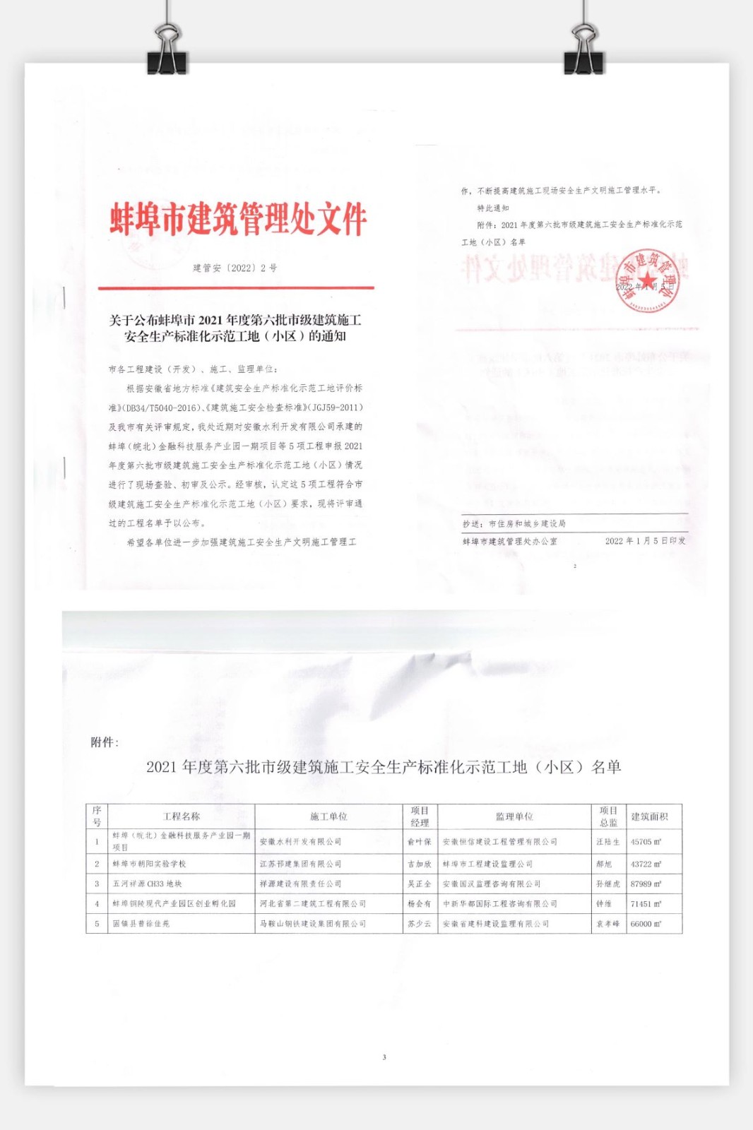 1月5日,蚌埠市建筑管理處下發(fā)通知,五分公司承建的蚌埠銅陵現代產(chǎn)業(yè)園區創(chuàng )業(yè)孵化園建設EPC項目榮獲蚌埠市2021年度第六批“市級建筑施工安全生產(chǎn)標準化示范工地”稱(chēng)號。
