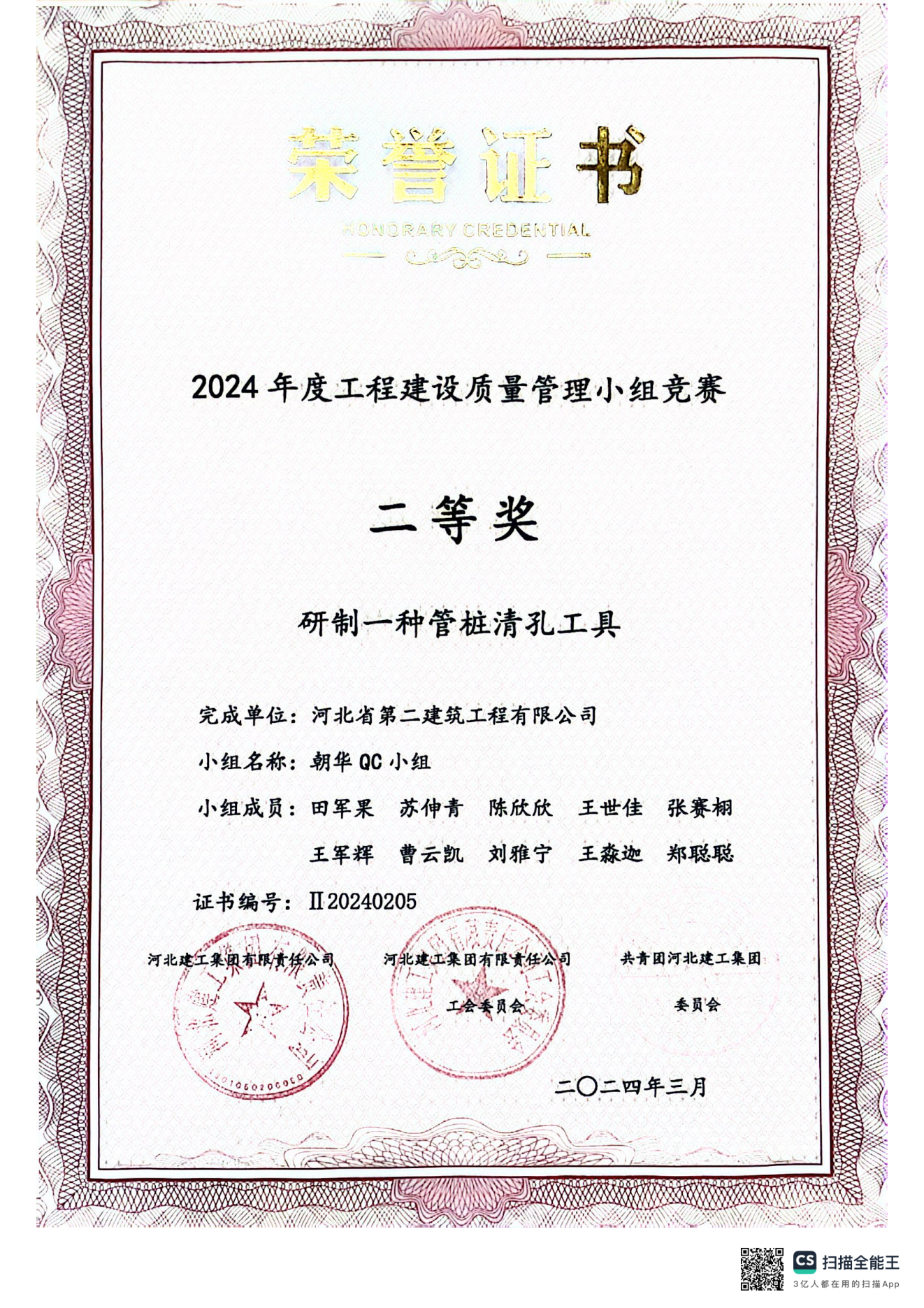 近日,由河北建工集團組織的“2024年度工程建設質(zhì)量管理小組活動(dòng)競賽”成功落下帷幕,公司共有兩項成果獲獎,三分公司朝華QC小組的《研制一種管樁清孔工具》榮獲二等獎,一分公司質(zhì)量先鋒QC小組的《提高熱力管道承插連接一次驗收合格率》榮獲三等獎。